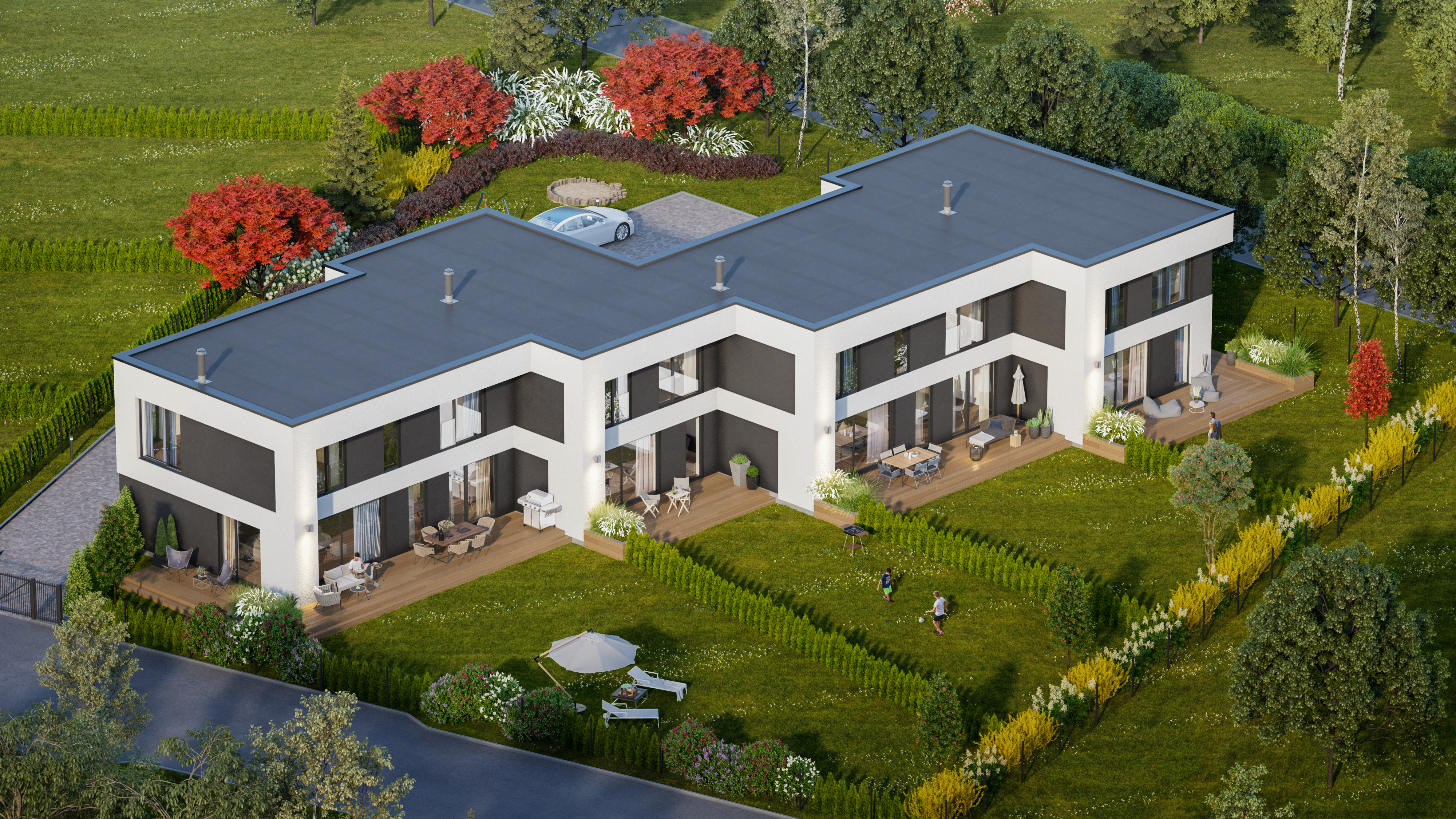 Hooned on ilmakaarte suhtes hästi planeeritud ja majade paigutusega kinnistul on kõigile tagatud privaatsus. Iga majaosa juurde kuulub oma privaatne aed, mis vastavalt kasutuskorrale jääb selle elanike ainukasutusse. Privaatala on eraldatud kadakahekiga. Ridaelamu ees, terves hoone pikkuses on avatud terrass, kus saab mõnusaid grilliõhtuid veeta.Majaosa hinna sees kaks parkimiskohta ja panipaik. Panipaik on ruumikas ning köetav, sissepääs eraldi uksest. Prügikastid ei vedele niisama aia ääres vaid nendele on ette nähtud väike katusealune, et need silma alla ei jääks. Autovärav on mugavalt puldiga avatav.